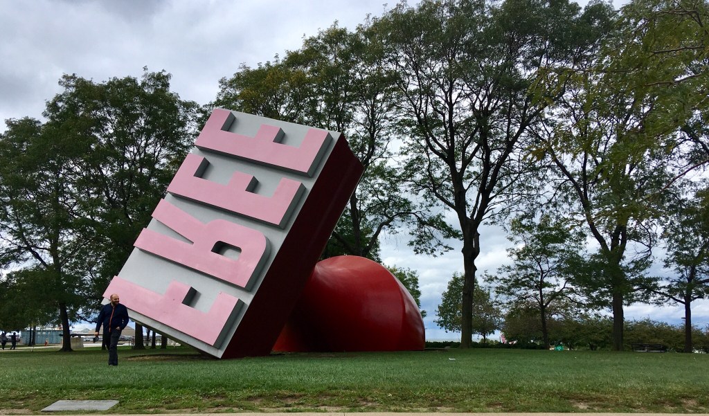 The stamp in the image is a giant pink stamp with the word “Free” written on it. The stamp is sitting on top of a red ball, which is a symbol of life. The stamp is a replica of the Free Stamp, a public art sculpture located in Willard Park in Cleveland, Ohio. The Free Stamp was created by Claes Oldenburg and Coosje van Bruggen in 1985. It is a 45-foot-tall (14 m) rubber stamp that is meant to represent the power of communication and the importance of freedom of expression.