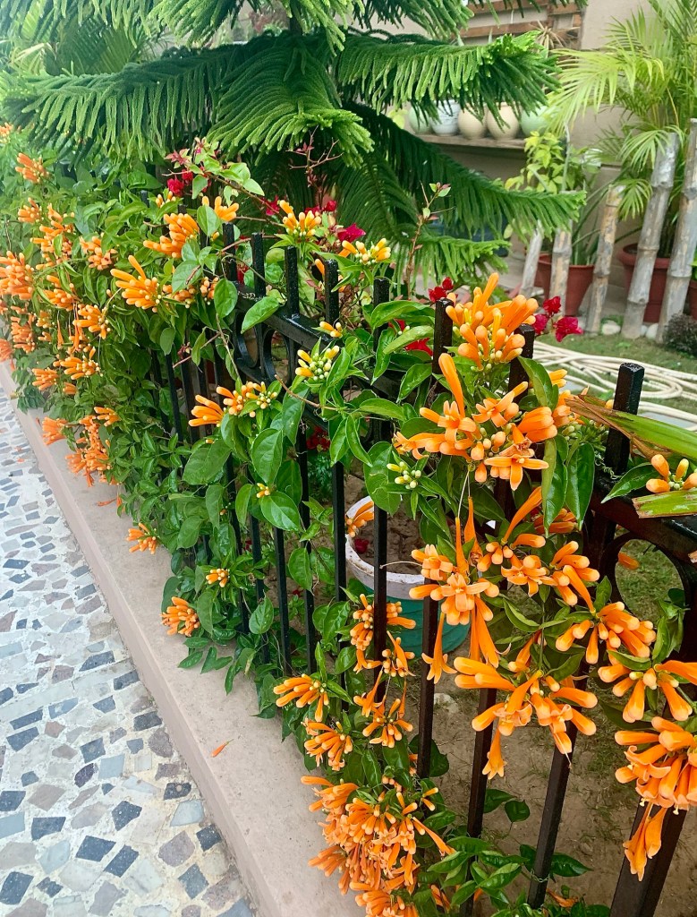 flowers in the picture are a type Pyrostegia venusta, also commonly known as flamevine or orange trumpet vine, is a plant species of the genus Pyrostegia of the family Bignoniaceae originally native to southern Brazil, Bolivia, northeastern Argentina and Paraguay; today, it is also a widely cultivated garden species. These are now available in Asia and in particular India.